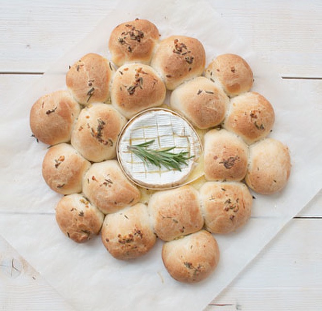Garneer het breekbrood met camembert uit de oven met een takje rozemarijn.